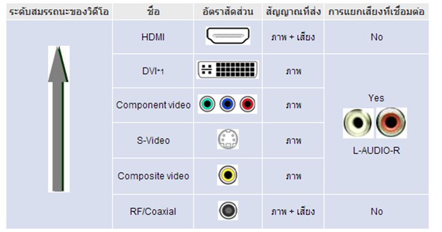 การเชื่อมต่อระบบภาพมีพอร์ตการเชื่อมต่อสัญญาณภาพที่หลากหลาย ดังนั้นในการเลือกใช้สายสัญญาณต้องคำนึงถึงพอร์ตการเชื่อมต่อและการใช้งาน เพราะสัญญาณแต่ละประเภทมีความละเอียดและความคมชัดที่แตกต่างกัน ดังนี้