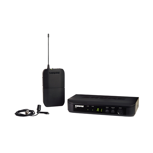 The BLX14/CVL Lavalier Wireless Microphone System from Shure includes a BLX4 single-channel wireless receiver, a BLX1 bodypack transmitter, and a CVL Centraverse clip-on lavalier mic. The system is set to Shure’s J10 frequency band and operates between 694-703 MHz.