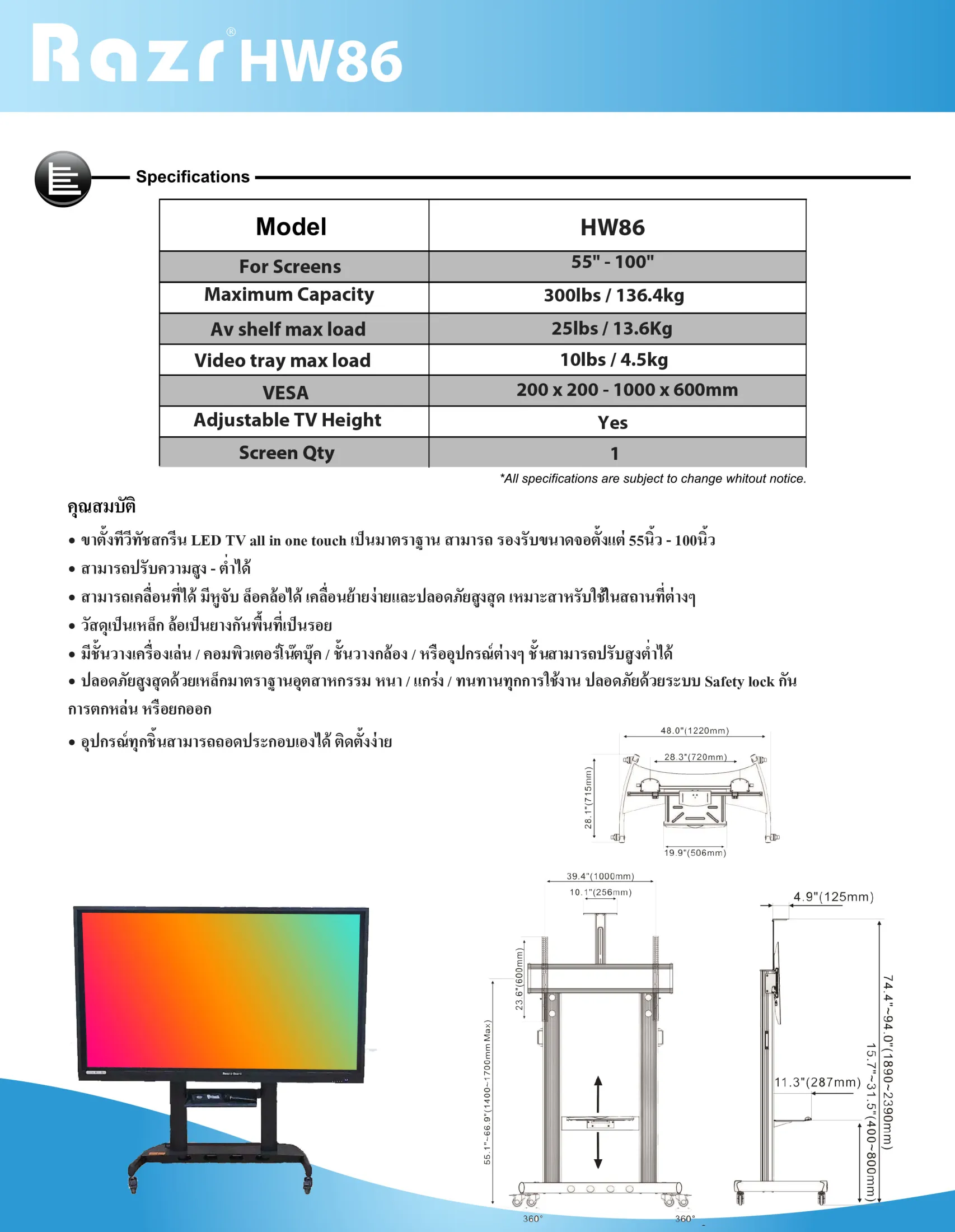 ขาล้อเลื่อนสำหรับจออัจฉริยะ 65-86 นิ้ว ยี่ห้อ เรสซ์ Razr รุ่น HW86