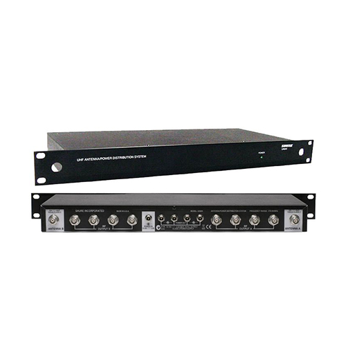 The Shure Model UA844+SWB is an antenna distribution system that allows for the expansion of wireless microphone systems by splitting one pair of antennas to multiple receivers. It also amplifies RF signals to compensate for insertion loss that results from splitting signal power to multiple outputs. A single UA844+SWB system can support up to five wireless receivers. A maximum of five UA844+SWB systems may be used in a two-tiered configuration.