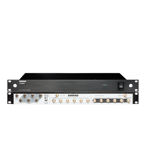The UA846Z2/LC GLX-D Frequency Manager, Less Antenna Cables from Shure connects up to six GLXD4R wireless rackmount receivers and offers improved channel count over GLX-D systems. It can be used to provide rock-solid RF performance and frequency management when operating multiple wireless receivers for live stage, theater, rehearsal, and other sound reinforcement applications.